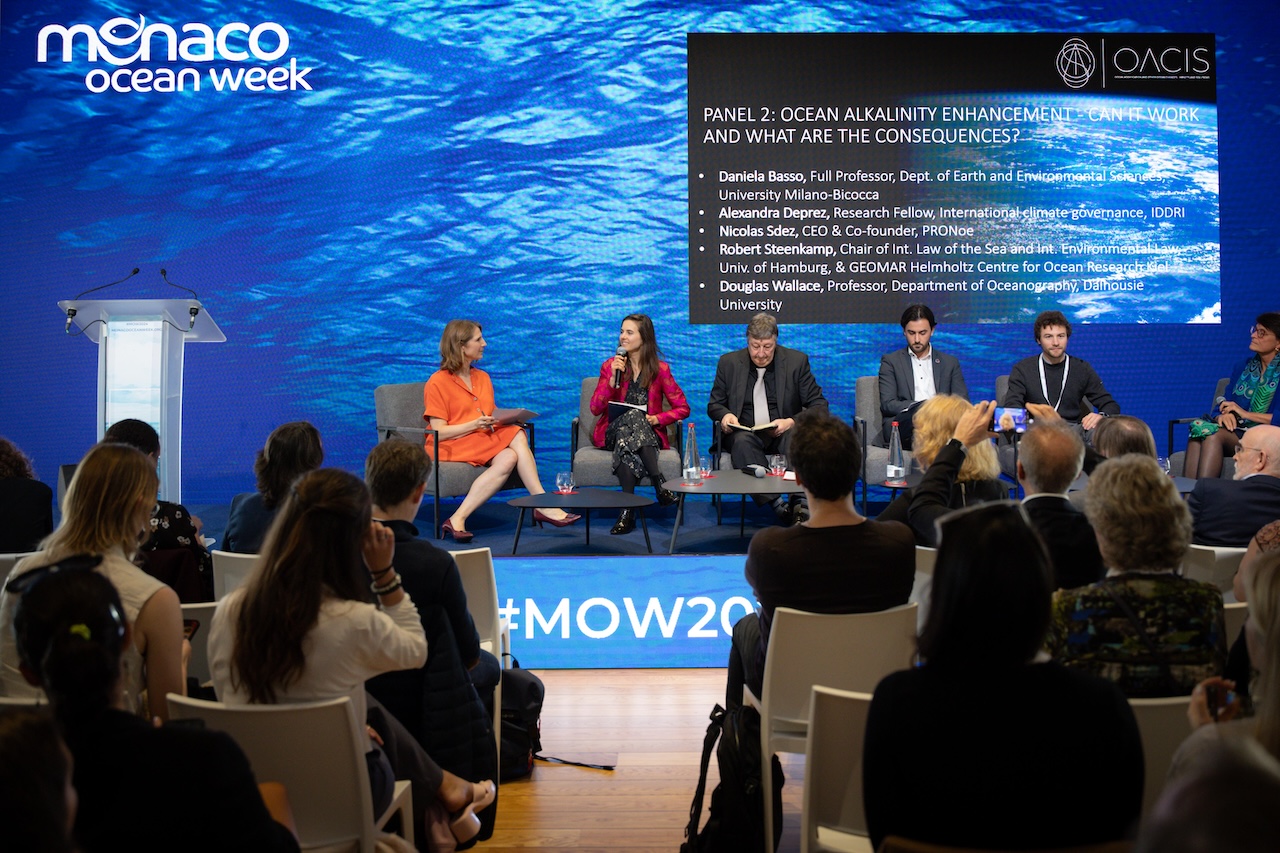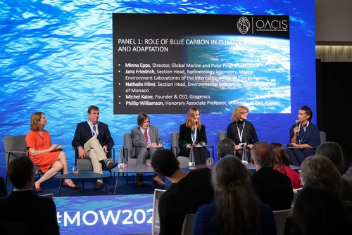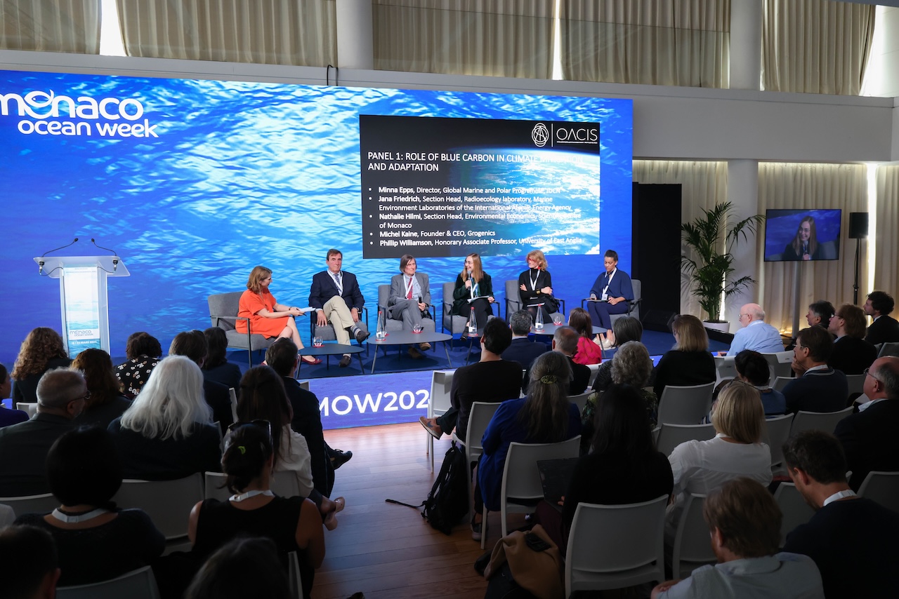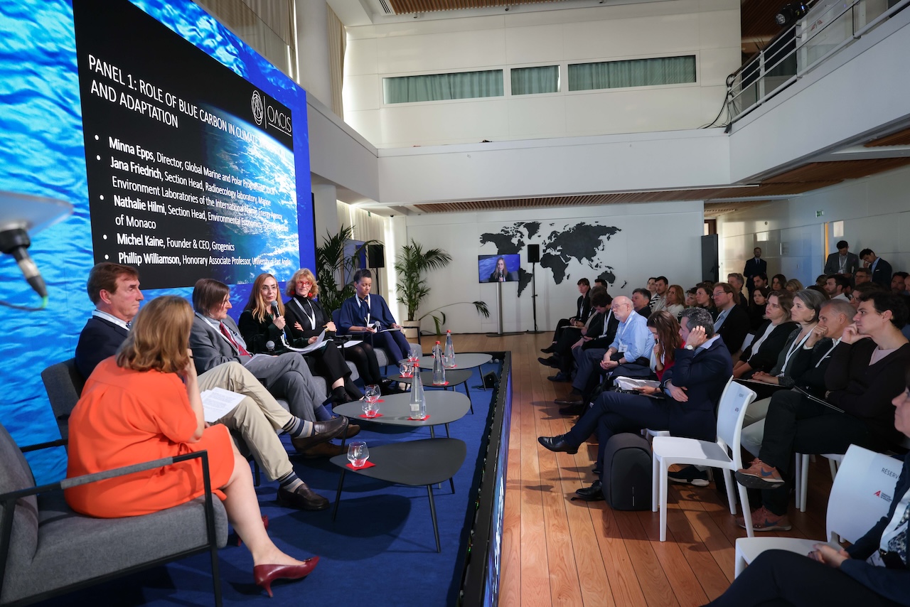 On the second day of the 2024 Monaco Ocean Week, this half day event debating the hot topic of potential ocean-based approaches to help address OA and climate change drew a full house. During two panel discussions, moderated by a journalist, experts from science, economy, conservation, policy and business debated the potential benefits and challenges of ocean-based measures to combat climate change and ocean acidification, with a special focus on protecting and restoring blue carbon ecosystems (a nature-based approach) and ocean alkalinity enhancement (a technological approach).